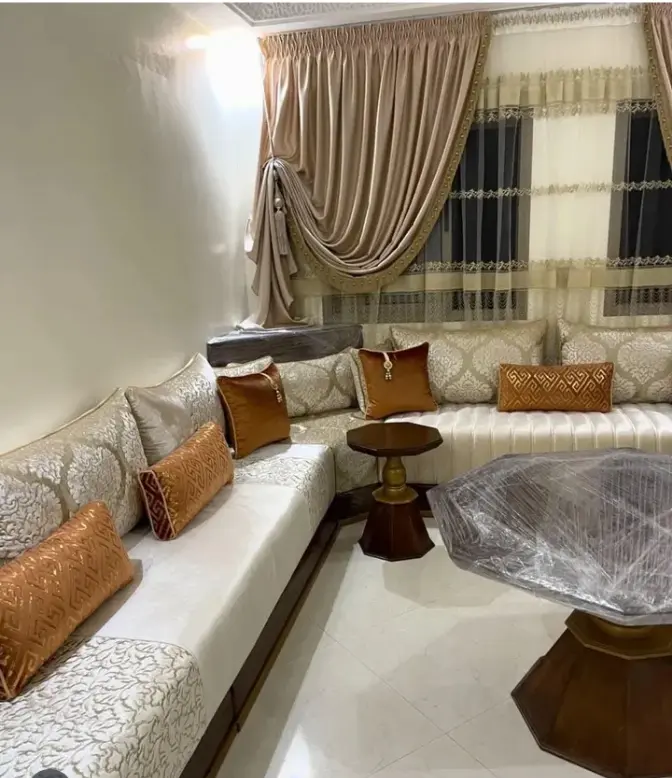 Découvrez « Al Andalus », notre salon traditionnel par excellence. Le contraste élégant entre le blanc et le bordeaux, associé à des tissus riches, en fait le centre de votre hospitalité. Confort, design et authenticité garantis.